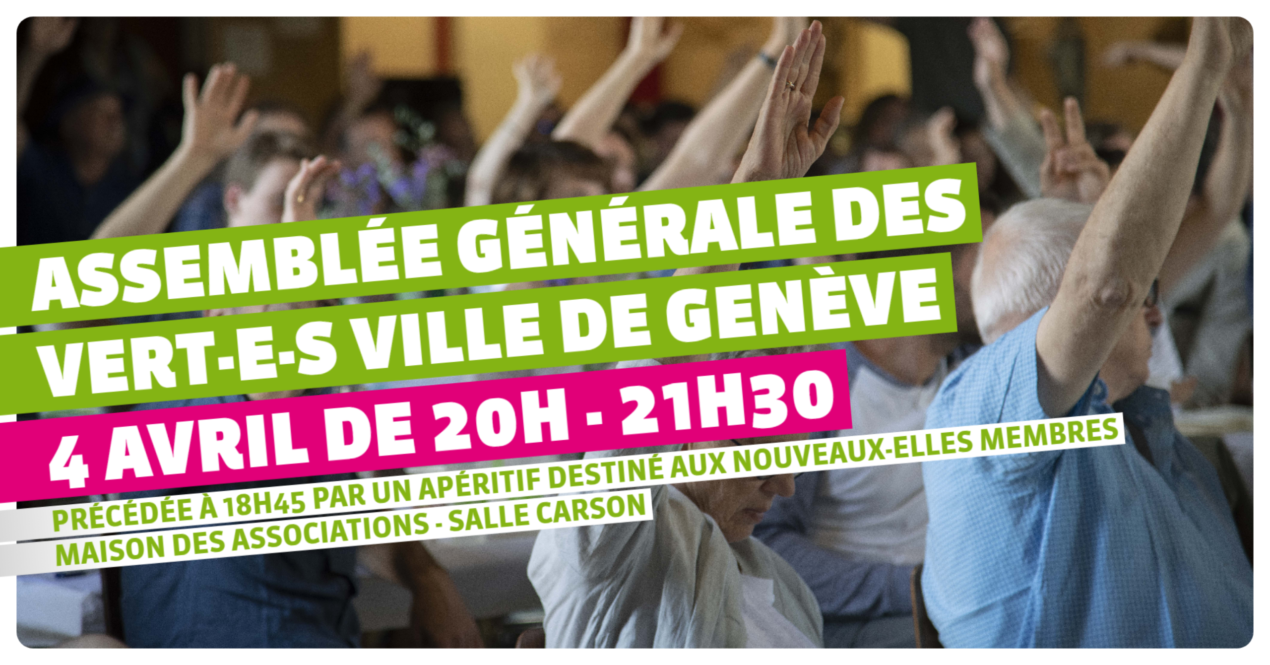 Nous avons le plaisir de vous convier à l’Assemblée générale des Vert-e-s Ville de Genève le mardi 4 avril à 20h à la Maison des associations (salle Carson).