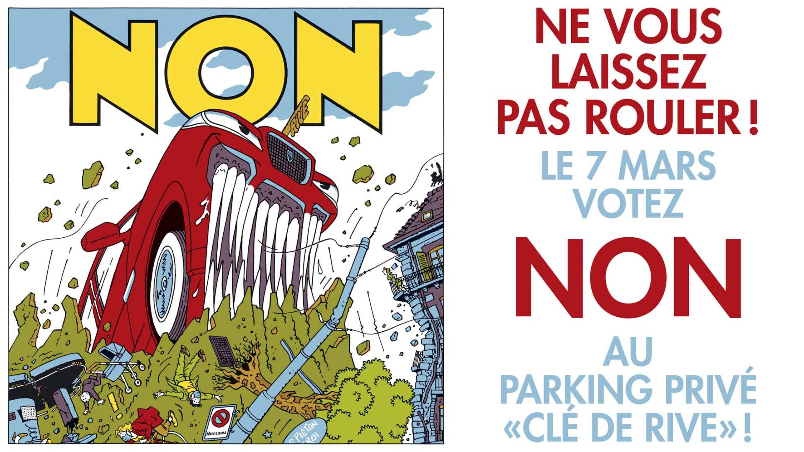 Avec notre campagne de communication, nous souhaitons avant tout informer la population sur les détails du projet. Une variante de l’affiche que nous avait proposé Exem s’intitulait justement « le diable se cache dans les détails ». Nous avons préféré le slogan : Ne vous faites pas rouler ! En effet, qui pourrait aujourd’hui se déclarer contre une zone piétonne ? Pourtant, c’est bien ici d’un parking qu’il s’agit et de céder une partie de l’espace public à un promoteur privé.