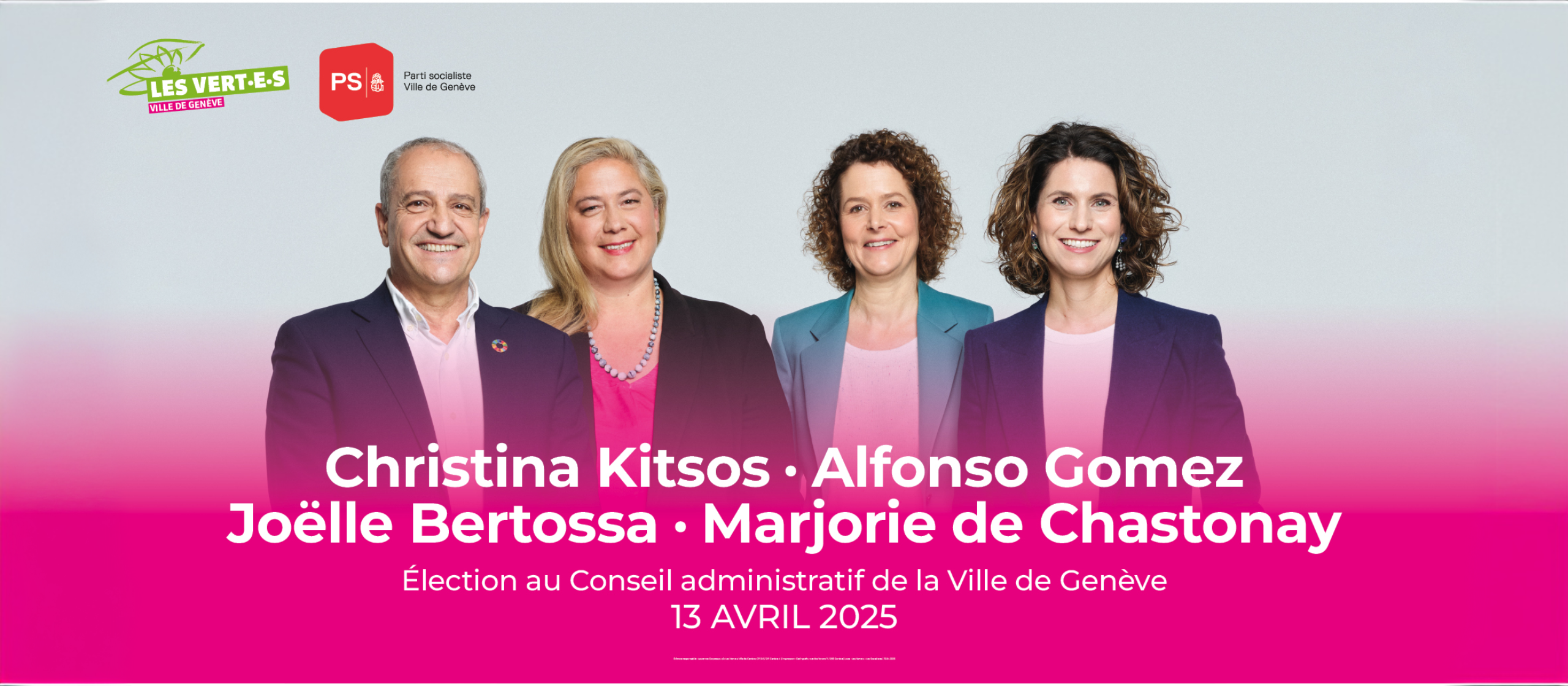 Les sections ville de Genève du Parti Socialiste et des Vert-e-s se félicitent de l’élection de leurs quatre candidat-e-s — Christina Kitsos, Alfonso Gomez, Joëlle Bertossa et Marjorie de Chastonay — au Conseil administratif de la Ville de Genève à l’issue du second tour de ce dimanche 13 avril 2025.