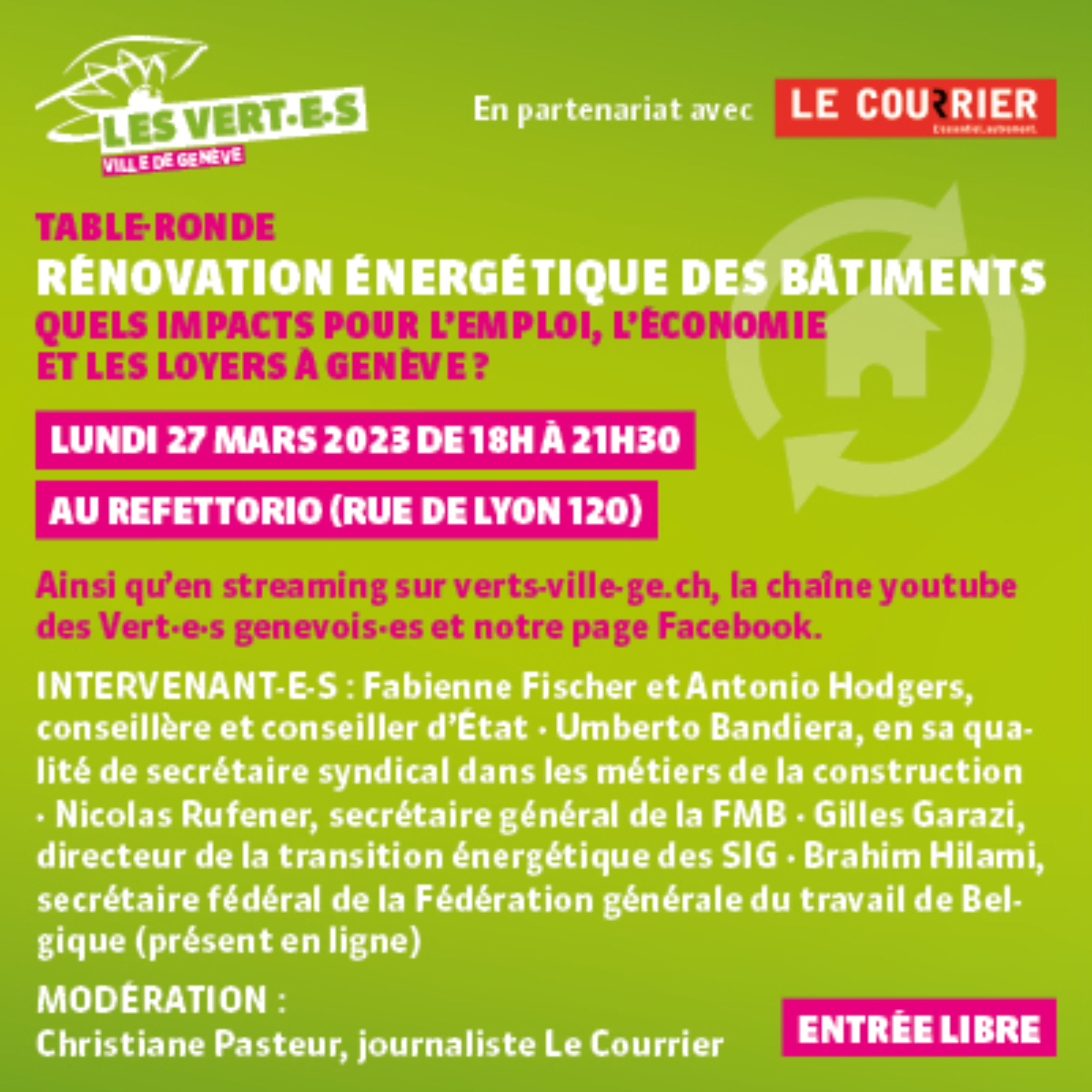 La section des Vert-e-s Ville de Genève a organisé, en partenariat avec Le Courrier, une table ronde « Rénovation énergétique des bâtiments : Quels impacts pour l’emploi, l’économie et les loyers à Genève ? », le lundi 27 mars dernier à 18h au Refettorio (rue de Lyon 120). Cette soirée a permis des échanges constructifs entre les acteurs et actrices de cette transition : les entreprises, les représentant-e-s des salarié-e-s, les SIG, et le Conseil d’Etat. Vous pouvez visionner le live par ICI !