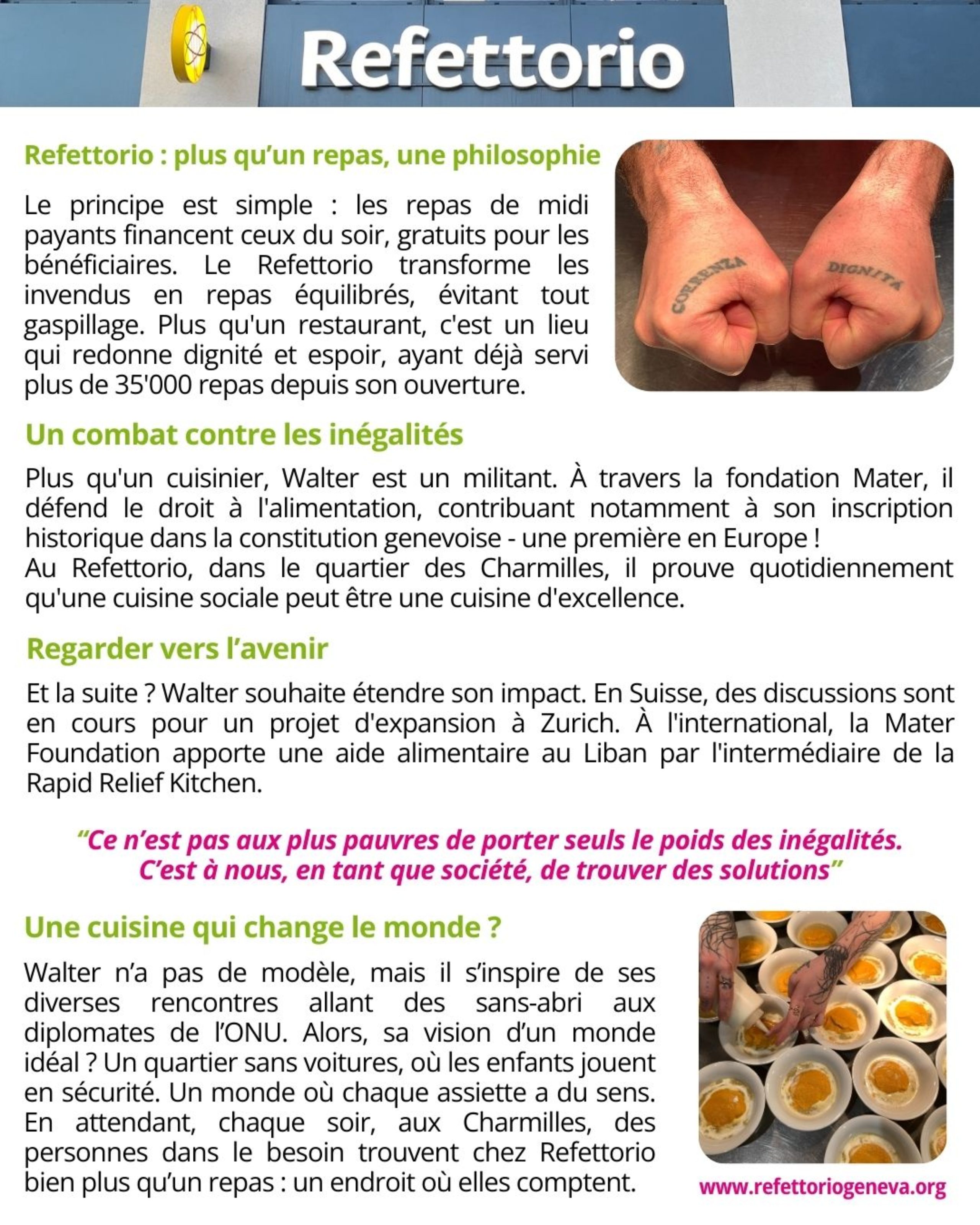 À Genève, des initiatives solidaires transforment la ville ! Le Refettorio, fondé par Walter el Nagar, propose chaque soir des repas gratuits aux personnes en difficulté. Après la fermeture de son restaurant « Le Cinquième Jour » en raison de la pandémie, Walter n’a pas baissé les bras : il a créé la Mater Foundation pour une aide alimentaire durable. Cette résilience et cette solidarité montrent qu’une ville plus juste et humaine est possible.