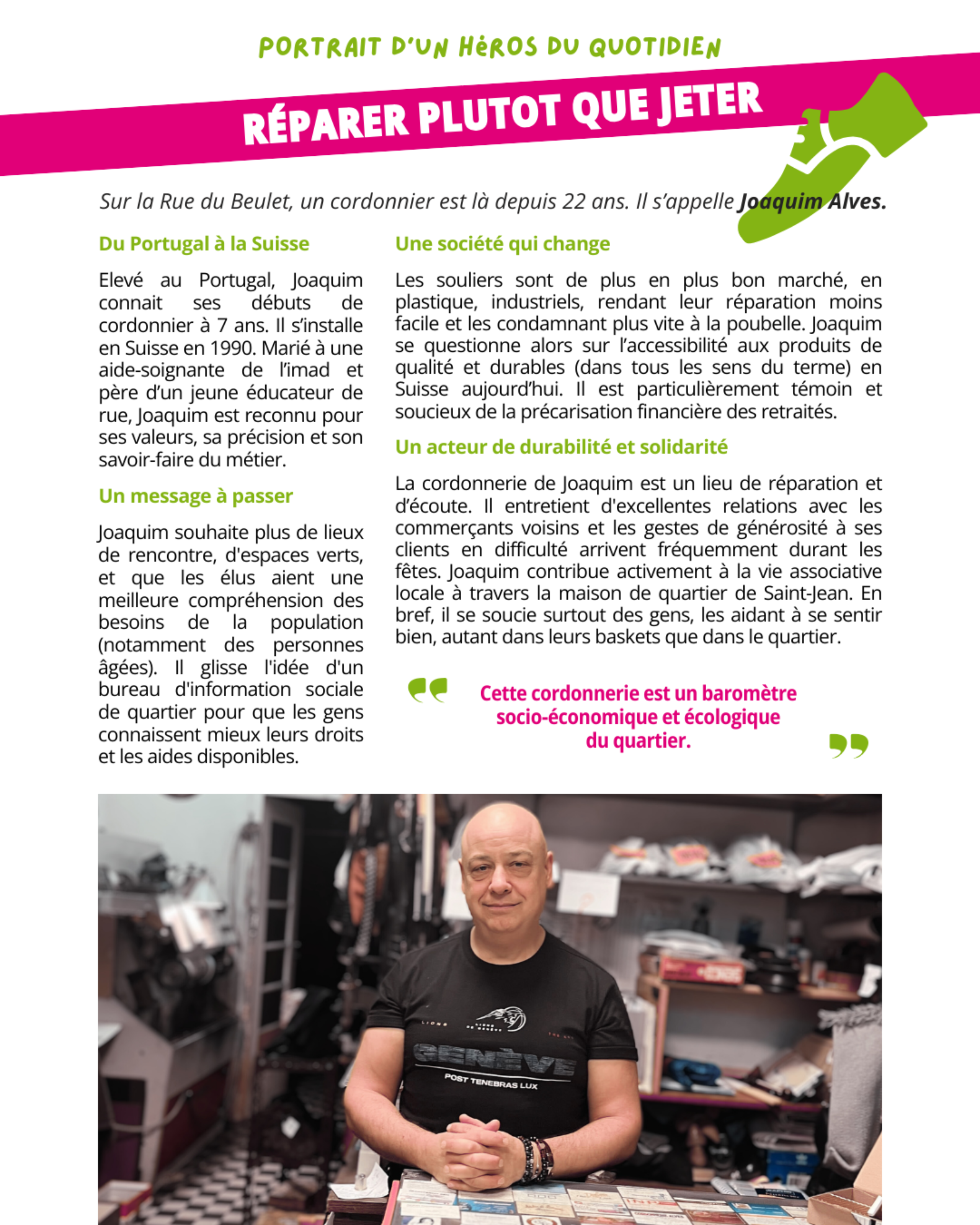 Joaquim Alves, cordonnier – Série « Héros du quotidien » par le groupe de quartier des Vert·e·s Saint-Jean-Charmilles-Concorde